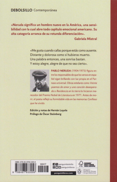Una de las obras más célebres del poeta Pablo Neruda.50.o ANIVERSARIO DE LA CONCESIÓN DEL PREMIO NOBEL A PABLO NERUDA«Me gusta cuando callas porque estás como ausente.Distante y dolorosa como si hubieras muerto.Una palabra entonces, una sonrisa bastan.Y estoy alegre, alegre de que no sea cierto.»Resena:«Neruda significa un hombre nuevo en la América, una sensibilidad con la cual abre todo capítulo emocional americano. Su alta categoría arranca de su rotunda diferenciación.»Gabriela Mistral