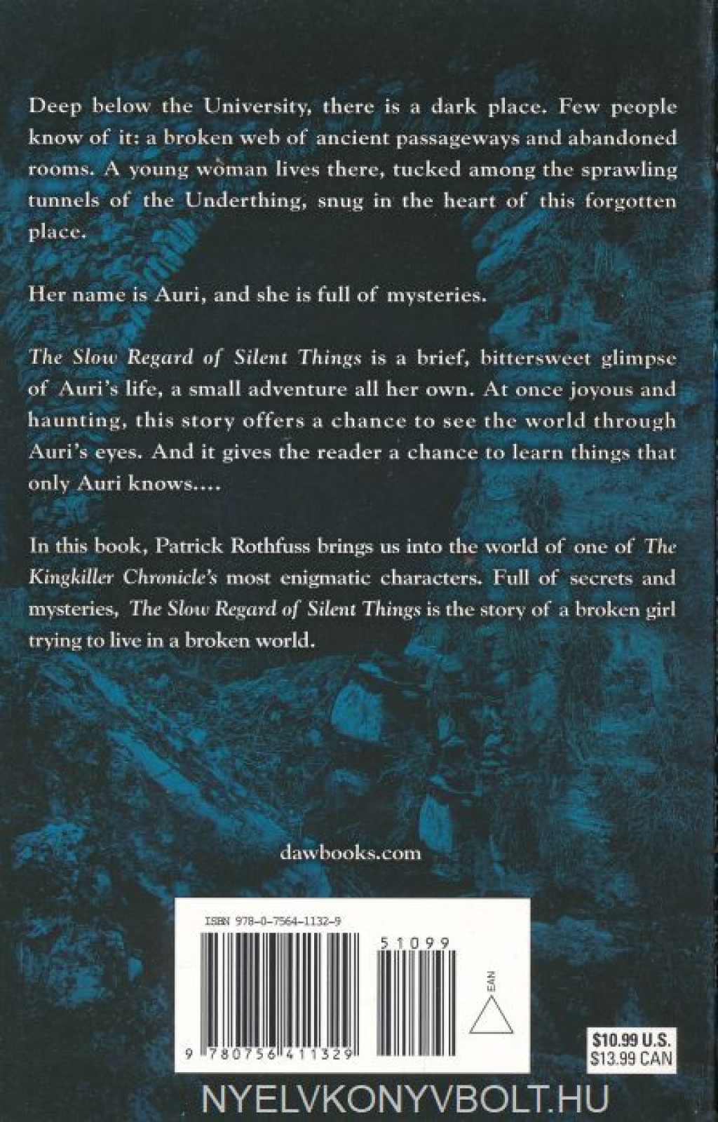 Deep below the University, there is a dark place. Few people know of it: a broken web of ancient passageways and abandoned rooms. A young woman lives there, tucked among the sprawling tunnels of the Underthing, snug in the heart of this forgotten place. Her name is Auri, and she is full of mysteries. The Slow Regard of Silent Things is a brief, bittersweet glimpse of Auri’s life, a small adventure all her own. At once joyous and haunting, this story offers a chance to see the world through Aurir’s eyes. And it gives the reader a chance to learn things that only Auri knows.... In this book, Patrick Rothfuss brings us into the world of one of The Kingkiller Chronicle’s most enigmatic characters. Full of secrets and mysteries, The Slow Regardof Silent Things is the story of a broken girl trying to live in a broken world.
