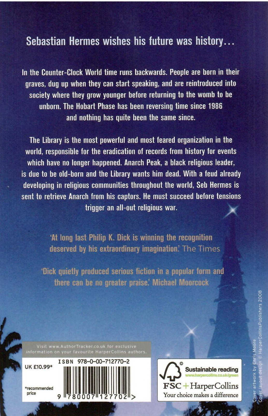 ...to grow younger and younger. Time runs backwards in the Counter-Clock World. Old people emerge from their graves, grow to middle age, youth, adolescence and childhood to be finally unborn in their mothers wombs. The most powerful – and most feared – organisation in the world is the Library, in charge of expunging the written records of events, which have no longer happened.When a powerful black leader is reborn, the Library's one concern is to eliminate him before the renewal of racial violence tears the country apart. But in this counter-clock year of 1998 it isn't that simple…This eerie and unforgettable premise encapsulates Philip K Dick's ambitious and inimitable approach to fiction writing. The attempts of his characters to cope with the bizarre reality of a world that runs backwards while their minds run forwards like ours, operate as a stunning critique of the way in which we perceive our own civilization.