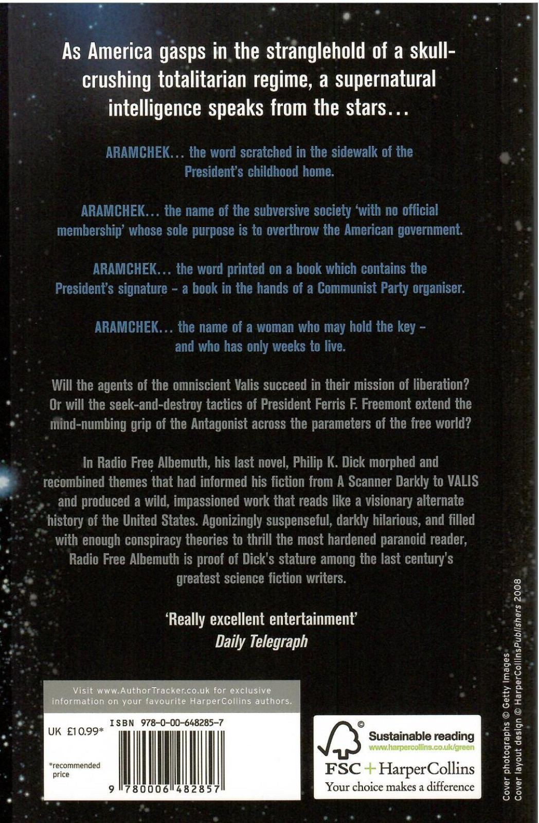 As America gasps in the stranglehold of a skull-crushing totalitarian regime, a supernatural intelligence speaks from the stars…ARAMCHEK… the word scratched in the sidewalk of the President’s childhood home.ARAMCHEK… the name of the subversive society ‘with no official membership’ whose sole purpose is to overthrow the American government.ARAMCHEK… the word printed on a book which contains the President’s signature – a book in the hands of a Communist Party organiser.ARAMCHEK… the name of a woman who may hold the key – and who has only weeks to live.Will the agents of the omniscient Valis succeed in their mission of liberation? Or will the seek-and-destroy tactics of President Ferris F. Freemont extend the mind-numbing grip of the Antagonistacross the parameters of the free world?In Radio Free Albemuth, his last novel, Philip K. Dick morphed and recombined themes that had informed his fiction from A Scanner Darkly to VALIS and produced a wild, impassioned work that reads like...