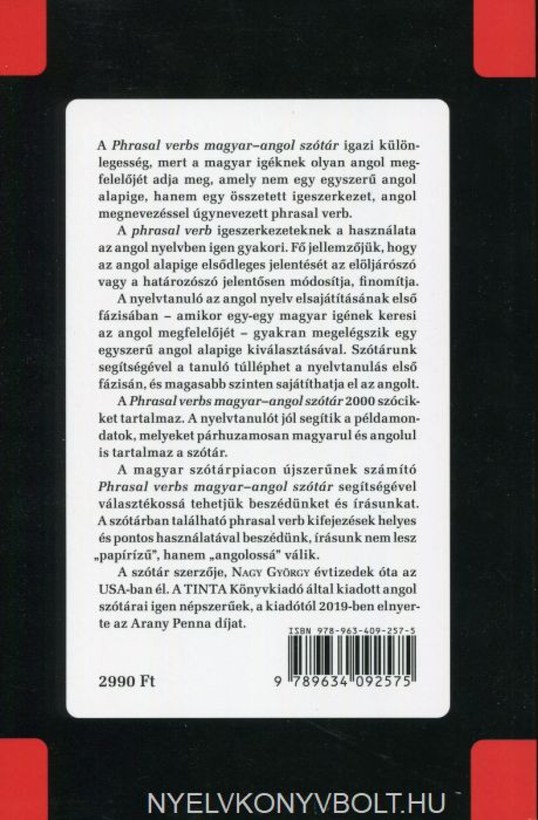 A Phrasal verbs magyar-angol szótár igazi különlegesség, mert a magyar igéknek olyan angol megfelelőjét adja meg, amely nem egy egyszerű angol alapige, hanem egy összetett igeszerkezet, angol megnevezéssel úgynevezett phrasal verb.