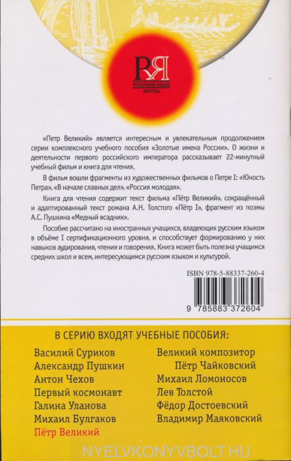 6-minutnyj uchebnyj film dajot jarkoe predstavlenie ob obraze Petra. V njom ispolzujutsja fragmenty iz khudozhestvennykh i nauchno-populjarnykh filmov, a takzhe videomaterialy, snjatye v razlichnykh muzejakh Rossii i Evropy. Kniga vkljuchaet tekst filmai zadanija raznogo tipa, prednaznachennye dlja vypolnenija pod rukovodstvom prepodavatelja.Vse teksty sostavleny na osnove leksiki i grammatiki, sootvetstvujuschej pevomu sertifikatsionnomu urovnju (V1) TRKI.Film zapisan na DVD i prednaznachen dlja prosmotra na kompjutere ili cherez DVD-pleer.