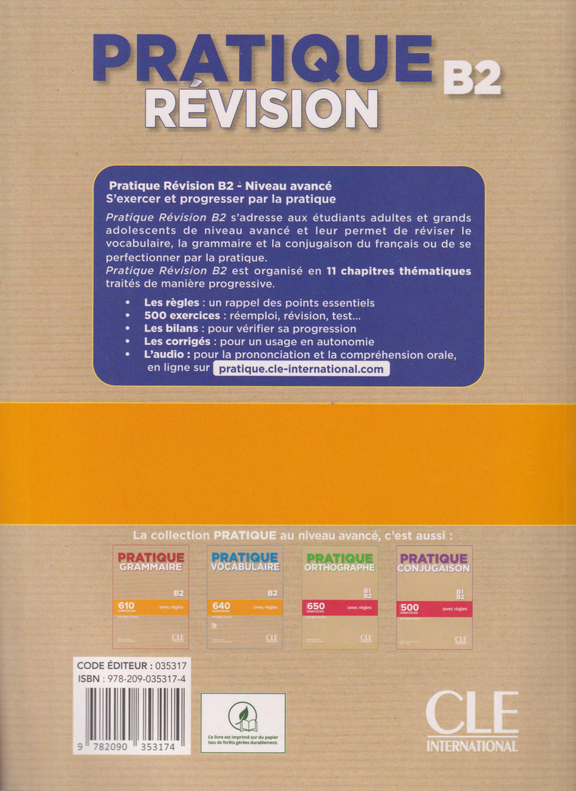 Pratique Révision B2 est organisé en 11 chapitres thématiques traités de maniere progressive.Les regles : un rappel des points essentiels500 exercices : réemploi, révision, test...Les bilans : pour vérifier sa progressionLes corrigés : pour un usage en autonomieL'audio : pour la prononciation et la compréhension orale, en ligne sur