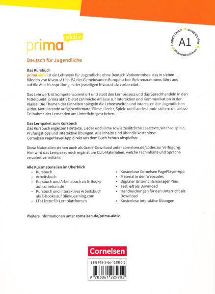 Die Verstärkung von ergebnisorientierten Projekt- und Kleingruppenmethoden, didaktisierten Videos, Songs und Lernspielen runden das abwechslungsreiche Lern- und Lehrangebot ab. Häufige Wiederholungsphasen sowie die schrittweise Vorbereitung auf die Prüfung Fit in Deutsch 1 festigen das Gelernte und bieten Ihren Schülerinnen und Schülern optimale Grundlagen für Lernerfolge.Die kostenlose Cornelsen PagePlayer-App ermöglicht es den Lernenden individuell nach Bedarf alle Audios (Dialoge und Songs), Wiederholungsaufgaben (interaktive Übungen) und Erklärvideos abzurufen. Filme im Vlogging-Format mit Jugendlichen thematisieren zusätzlich landeskundliches Wissen der D-A-CH Regionen.Das Kursbuch enthält einen eingedruckten Lizenzcode zur kostenlosen Freischaltung der interaktiven Übungen auf mein.cornelsen.de.