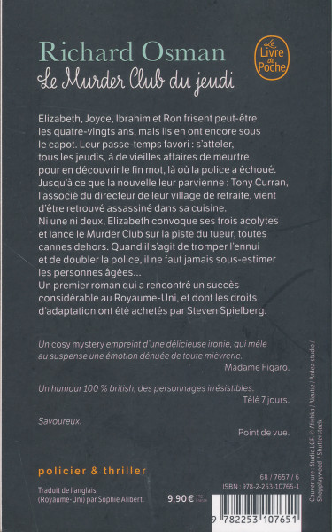 Elizabeth, Joyce, Ibrahim et Ron frisent peut-etre les quatre-vingts ans, mais ils en ont encore sous le capot. Leur passe-temps favori : s'atteler, tous les jeudis, a de vieilles affaires de meurtre, pour en découvrir le fin mot la ou la police a échoué. Jusqu'a ce que la nouvelle leur parvienne : Tony Curran, l'associé du directeur de leur village de retraite, vient d'etre retrouvé assassiné dans sa cuisine.Ni une ni deux, Elizabeth convoque ses trois acolytes et lance le Murder Club sur la piste du tueur, toutes cannes dehors. Quand il s'agit de tromper l'ennui et de doubler la police, il ne faut jamais sous-estimer les personnes âgées…