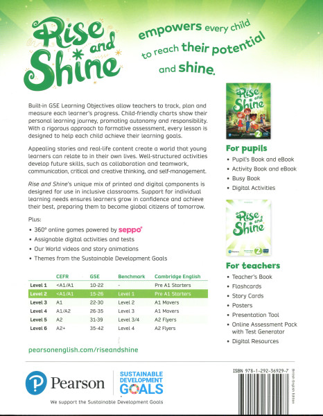 Rise and Shine's unique methodology helps learners understand how far they've come on their learning English journey. Targeted support helps learners grow in confidence and achieve their best, preparing them to become global citizens of tomorrow.Featuring imaginative stories and activities to encourage cognitive engagement, with a strong focus on building communication skills and confidence. Rise and Shine learners face exciting tasks that help them build a greater understanding of themselves and the world around them while working towards clear learning goals.Rise and Shine is specially developed to support every pupil to achieve their best. Creating an inclusive environment helps those with learning differences and supports those who don't by making them more aware, tolerant and understanding of each other.