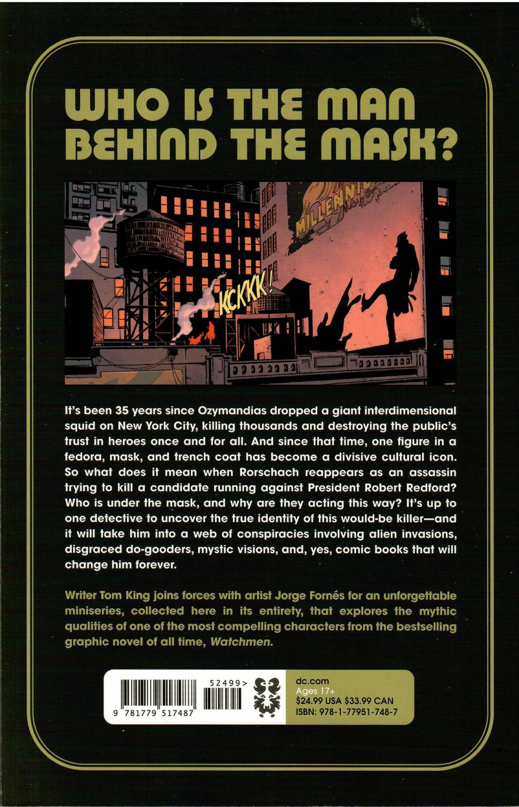 And since that time, one figure in a fedora, mask, and trench coat has become a divisive cultural icon. So what does it mean when Rorschach reappears as an assassin trying to kill a candidate running against President Robert Redford? Who is the man behind the mask, and why is he acting this way? It's up to one detective to uncover the true identity of this would-be killer--and it will take him into a web of conspiracies involving alien invasions, disgraced do-gooders, mystic visions, and yes, comic books. Writer Tom King joins forces with artist Jorge Fornés for a new miniseries that explores the mythic qualities of one of the most compelling characters from the bestselling graphic novel of all time, Watchmen.
