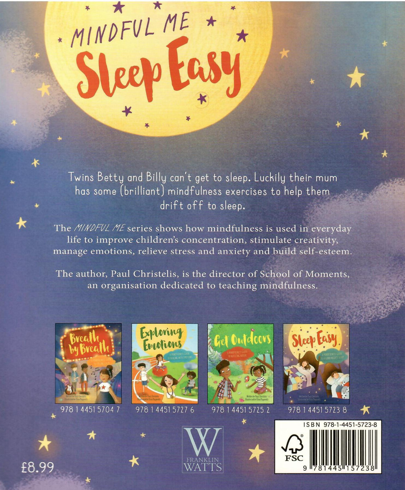 This story follows the adventures of twins, Billy and Betty, as they struggle to get to sleep. Billy's mind is noisy, constantly chattering, keeping him awake. Betty finds, as soon as her eyes close, that she starts to worry about what will happen the next day at school: will her friend Helen want to play with her? And what about that spelling test!The story shows how they use mindfulness to help them fall asleep.