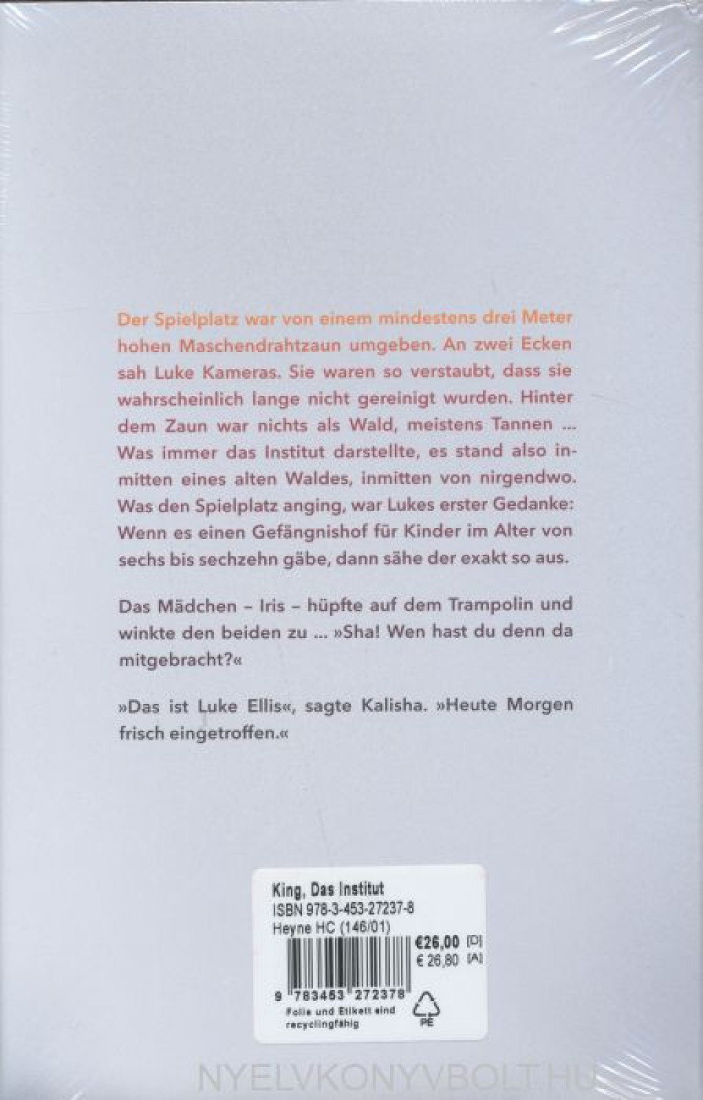In einer ruhigen Vorortsiedlung von Minneapolis ermorden zwielichtige Eindringlinge lautlos die Eltern von Luke Ellis und verfrachten den betäubten Zwölfjährigen in einen schwarzen SUV. Die ganze Operation dauert keine zwei Minuten. Luke wacht weit entfernt im Institut wieder auf, in einem Zimmer, das wie seines aussieht, nur dass es keine Fenster hat. Und das Institut in Maine beherbergt weitere Kinder, die wie Luke paranormal veranlagt sind: Kalisha, Nick, George, Iris und den zehnjährigen Avery. Siebefinden sich im Vorderbau des Instituts. Luke erfährt, dass andere vor ihnen nach einer Testreihe im »Hinterbau« verschwanden. Und nie zurückkehrten. Je mehr von Lukes neuen Freunden ausquartiert werden, desto verzweifelter wird sein Gedanke an Flucht,damit er Hilfe holen kann. Noch nie zuvor ist jemand aus dem streng abgeschirmten Institut entkommen.