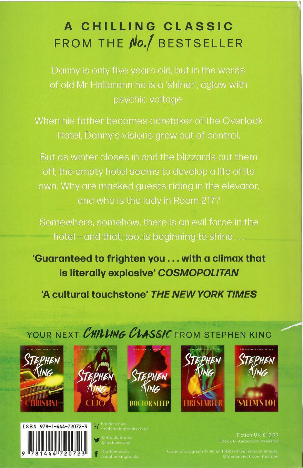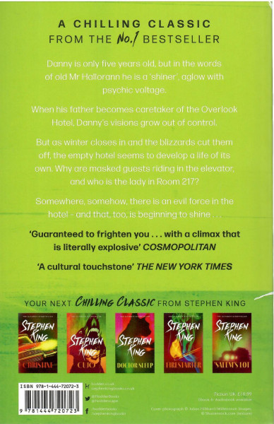 Danny is only five years old, but in the words of old Mr Hallorann he is a 'shiner', aglow with psychic voltage. When his father becomes caretaker of the Overlook Hotel, Danny's visions grow out of control.As winter closes in and blizzards cut them off, the hotel seems to develop a life of its own. It is meant to be empty. So who is the lady in Room 217 and who are the masked guests going up and down in the elevator? And why do the hedges shaped like animals seem so alive?Somewhere, somehow, there is an evil force in the hotel - and that, too, is beginning to shine . . .