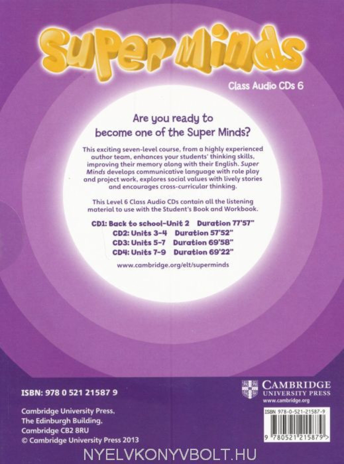 Super Minds develops language creatively with activities including role play and project work. Social values are explored with lively stories and cross-curricular thinking is covered through fascinating 'English for school' sections.These Level 6 Class Audio CDs contain all the listening material to use with the Level 6 Student's Book and Workbook.