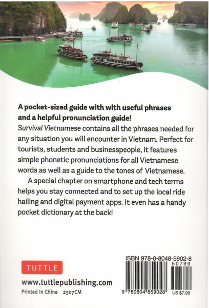 Survival Vietnamese contains all the right phrases for any situation you will encounter when visiting Vietnam. Perfect for tourists, students and business people, it features simple phonetic pronunciations for Vietnamese words as well as a guide to the difficult tones of Vietnamese—to ensure you can make yourself understood!A special chapter on smartphone and tech terms helps you stay connected when you are there and to set-up the local ride hailing and digital payment apps so you can get around. It even has a handy pocket dictionary at the back!