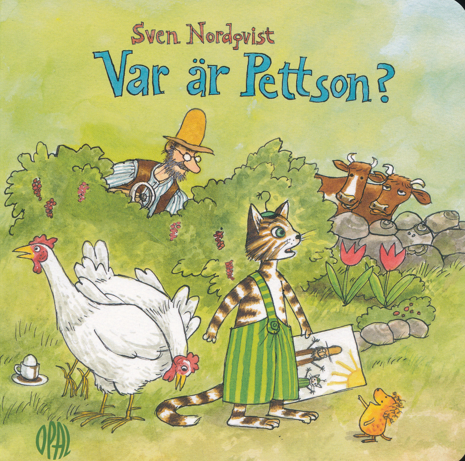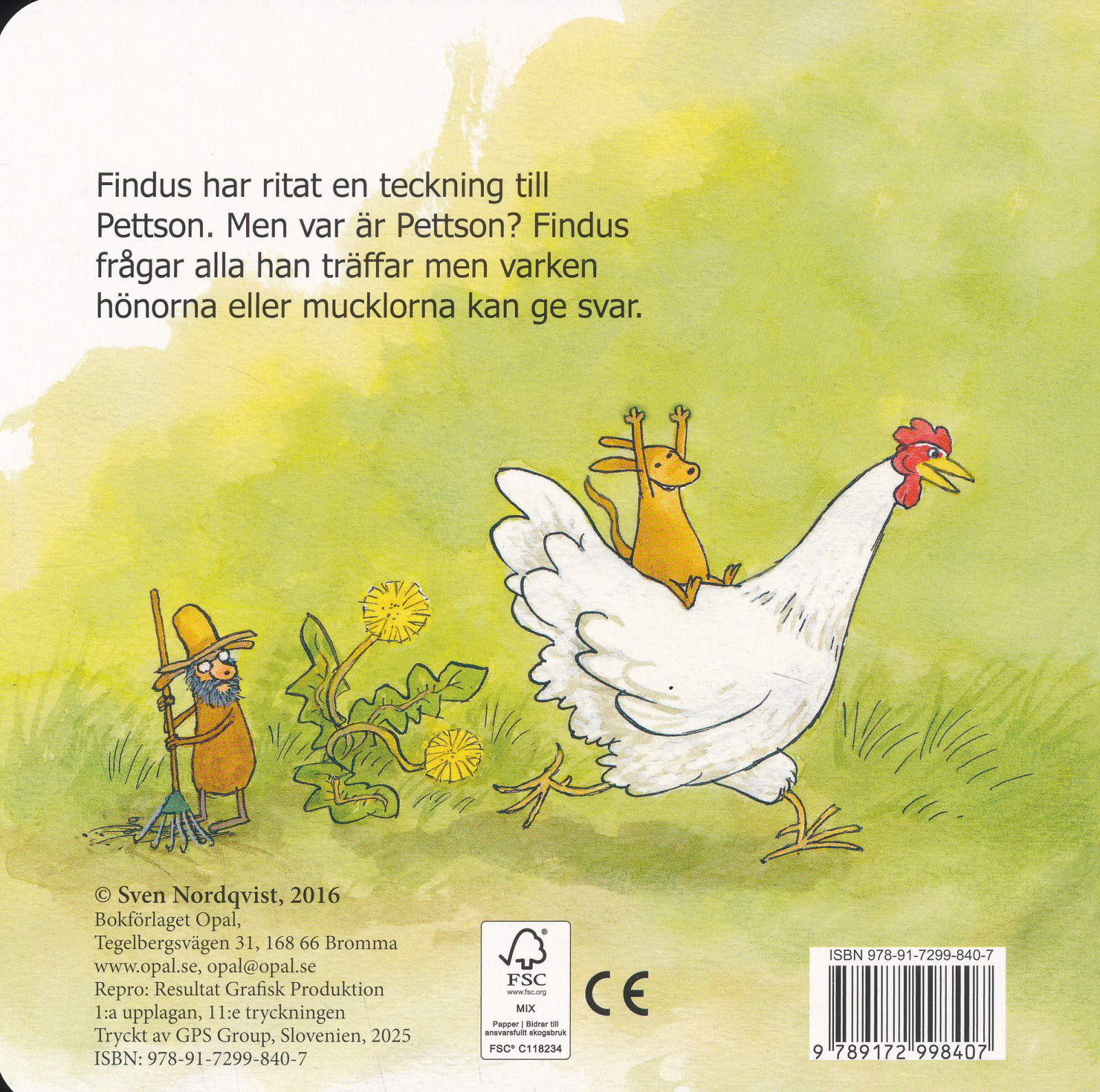 Han fragar korna, mucklorna och hönorna men far mest konstiga svar.Var är Pettson? Gavs ut i större format med pussel 2015.
