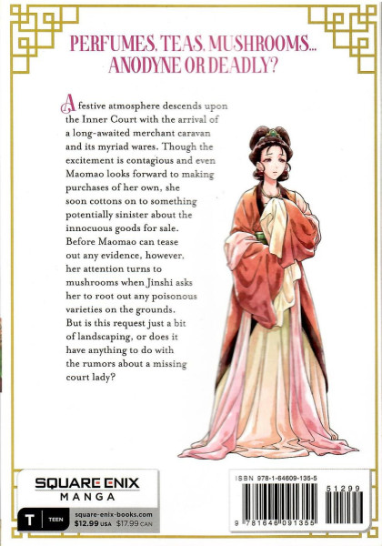 A festive atmosphere descends upon the Inner Court with the arrival of a long-awaited merchant caravan and its myriad wares. Though the excitement is contagious and even Maomao looks forward to making purchases of her own, she soon cottons on to something potentially sinister about the innocuous goods for sale.Before Maomao can tease out any evidence, however, her attention turns to mushrooms when Jinshi asks her to root out any poisonous varieties on the grounds. But is this request just a bit of landscaping or does it have anything to do with the rumors making the rounds about a court lady who has gone missing?