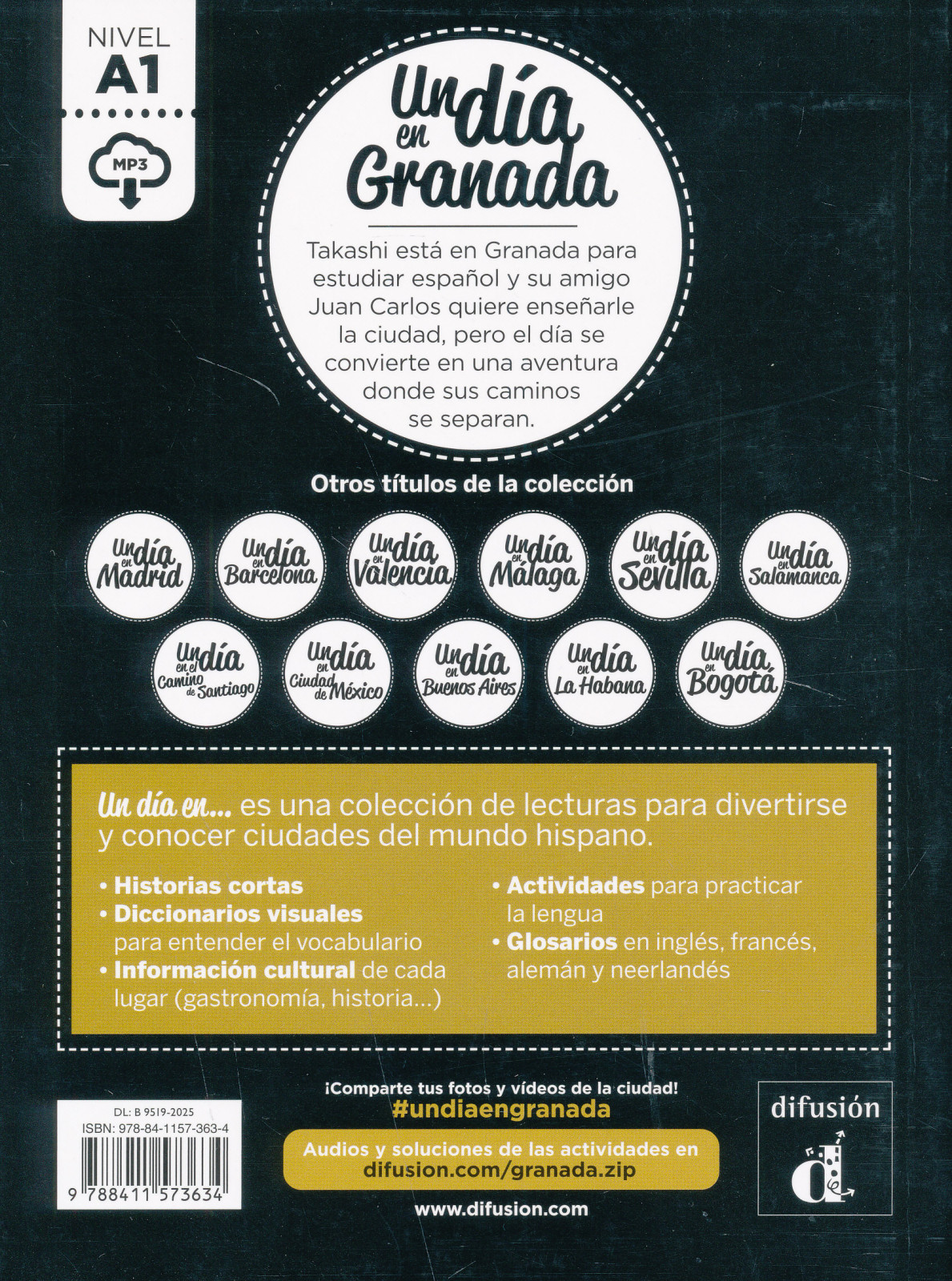 Az Un día en… sorozat olvasmányai nem csak szórakoztatóak, de segítségükkel megismerhetjük a spanyol ajkú világ városait.rövid történetekképes szószedetek, melyeknek a segítségével megérthetjük a szókincsetkulturális információk minden egyes helyről (gasztronómia, történelem)feladatok a nyelv gyakorlásáhozletölthető, MP3 hanganyag