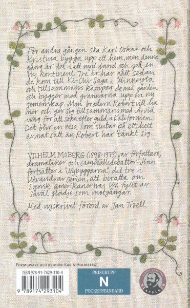 Vilhelm Moberg fortsätter i Nybyggarna att berätta om svensk-amerikanernas liv, fyllt av saväl glädje som motgangar. Genom bade Jan Troells rosade filmer och Björn Ulvaeus. För andra gangen ska Karl Oskar och Kristina bygga upp ett hem, men denna gang är det i ett nytt land och pa en ny kontinent. Tillsammans kämpar de med den nya garden och bygger med grannarna upp en ny gemenskap.Vilhelm Moberg fortsätter i Nybyggarna att berätta om svensk-amerikanernas liv, fyllt av saväl glädje som motgangar. Genom bade Jan Troells rosade filmer och Björn Ulvaeus och Benny Anderssons hyllade musikal "Kristina fran Duvemala" har serien ocksa levt vidare. Utvandrarserien är en tidlös kärlekshistoria kantad av hungersnöd, drömmar och längtan.