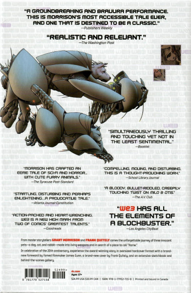 Writer Grant Morrison and artist Frank Quitely deliver the emotional journey of WE3 - three house pets weaponized for lethal combat by the government - as they search for "home" and ward off the shadowy agency who created them.