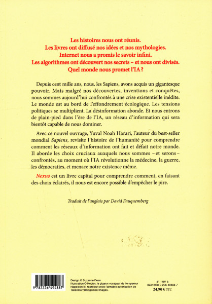 Depuis cent mille ans, nous, les Sapiens, avons acquis un gigantesque pouvoir. Mais malgré nos découvertes, inventions et conquetes, nous sommes aujourd'hui confrontés a une crise existentielle inédite. Le monde est au bord de l'effondrement écologique.Les tensions politiques se multiplient. La désinformation abonde. Et nous entrons de plain-pied dans l'ere de l'IA, un réseau d'information qui sera bientôt capable de nous dominer.Avec ce nouvel ouvrage, Yuval Noah Harari, l'auteur du best-seller mondial Sapiens, revisite l'histoire de l'humanité pour comprendre comment les réseaux d'information ont fait et défait notre monde. Il aborde les choix cruciaux auxquels nous sommes - et serons - confrontés, au moment ou l'IA révolutionne la médecine, laguerre, les démocraties, et menace notre existence meme.Nexus est un livre capital pour comprendre comment, en faisant des choix éclairés, il nous est encore possible d'empecher le pire.